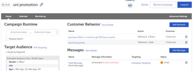 You define behaviors in the Campaigns module of the SessionM platform. You define the behaviors for a specific campaign on that campaign’s Setup page, shown below.